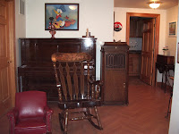 The only thing of mine in the room is the rocking chair (the little red one is his). You can see into the bathroom / darkroom. To the right just out of the picture is one of the entrances into the railroad room, and then there is a Murphy bed he built. We move the table and chairs, and guests have a place to sleep.